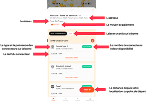 Les sigles avec le symbole⚡vous confirment que la carte de recharge Power est acceptée. Vous pouvez également voir le statut, libre, occupée ou hors service, des bornes présentes sur le point de recharge sélectionné.